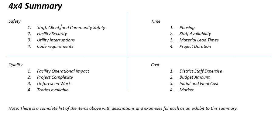 So, how do you “SELECT” the BEST delivery method for a project? How do you explain the reasoning behind the selection to the governing board? This blog will present multiple factors wrapped up into 4 categories that MUST be evaluated prior to selecting a delivery method for a project. We will explore a matrix to allow Owners, Architects, and Contractors to prioritize the 4 categories along with all their characteristics.